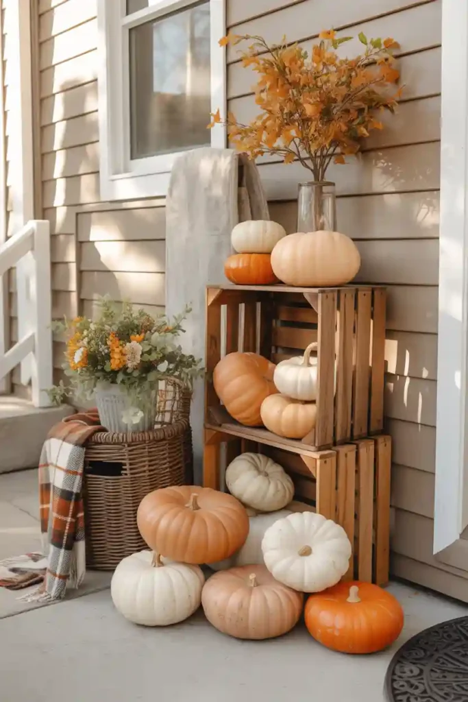 A layered pumpkin arrangement instantly creates a festive autumn welcome. Start by mixing real and faux pumpkins in varying sizes, shapes, and soft seasonal shades like creamy white, muted sage, dusty orange, and warm caramel. Place larger pumpkins directly on the porch floor or steps while grouping medium ones in clusters near the door frame. Smaller decorative gourds can be styled inside baskets or wooden crates for added dimension. This layered styling approach makes the entry feel abundant yet thoughtfully curated.